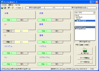 起動後の画面には、空白の単語カードが10枚並んでいます。メニューから学習したい内容(データ)を選択し、単語カードに問題文や単語を表示させます。裏の答えを見るには、個々の単語カードの下にある「答え」をクリックするだけです。10枚分のカードの内容を暗記したら、カードの「並び変え」ボタンを押し、次の10枚に切り替えましょう。